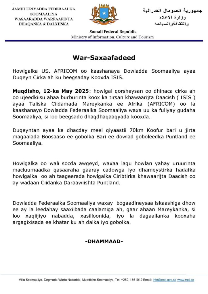 Mogadishu, May 12, 2025 – The United States Africa Command (AFRICOM), in coordination with the Federal Government of Somalia, has carried out a precision airstrike targeting members of the ISIS-affiliated Khawarij group operating in Somalia.