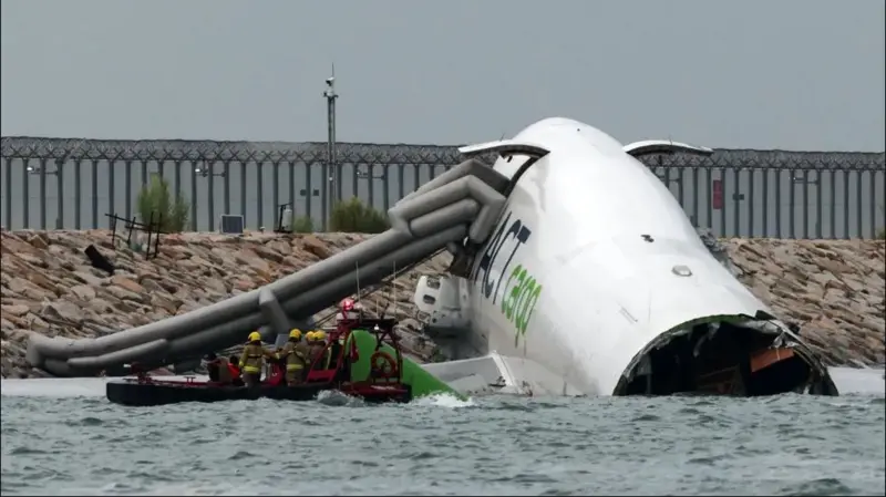 A cargo plane skidded off the runway at Hong Kong International Airport early Monday morning, crashing through a fence and plunging partway into the sea. The incident left two airport workers dead after the aircraft collided with their security vehicle.
