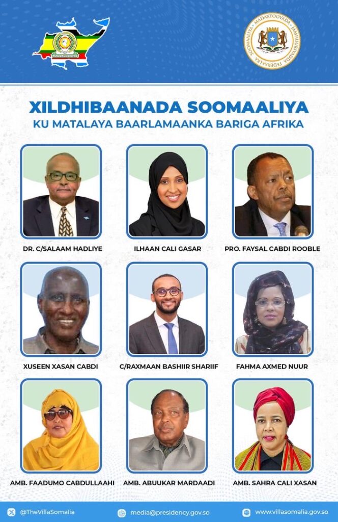 Muqdisho, Oktoobar 15, 2025; Madaxweynaha Jamhuuriyadda Federaalka Soomaaliya Mudane Xasan Sheekh Maxamuud ayaa hambalyo u diray Xildhibaannada Soomaaliyeed ee labada aqal ee Baarlamaanka Federaalka Soomaaliya maanta u doorteen in ay Soomaaliya ku matalaan Baarlamaanka Bariga Afrika.