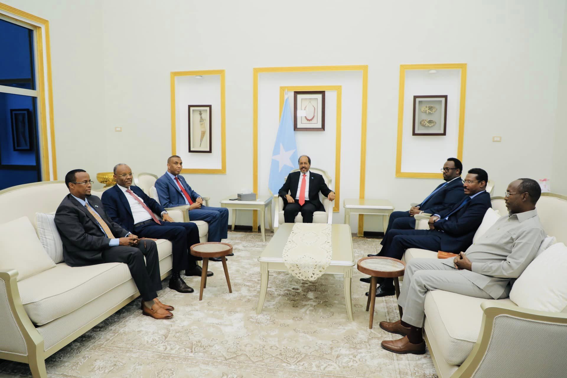 Madaxweynaha Jamhuuriyadda Federaalka Soomaaliya Mudane Dr. Xasan Sheekh Maxamuud ayaa guddoominaya Shirka Golaha Wadatashiga Qaranka ee Dowladda Federaalka iyo Dowlad-Goboleedyada xubnaha ka ah Dowladda Federaalka Soomaaliya, kaasi oo maanta dib ugu furmay Xarunta Madaxtooyada Qaranka.