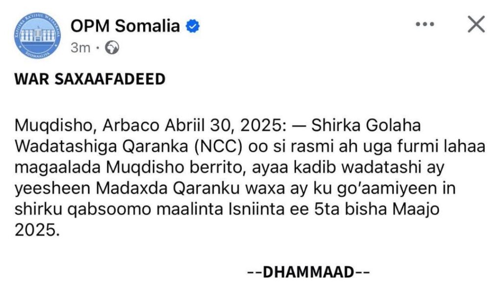 The Office of the Prime Minister of Somalia has officially announced the postponement of the National Consultative Council (NCC) meeting, initially scheduled to commence tomorrow in Mogadishu. The meeting is now rescheduled for Monday, May 5, 2025, following consultations among national leaders.