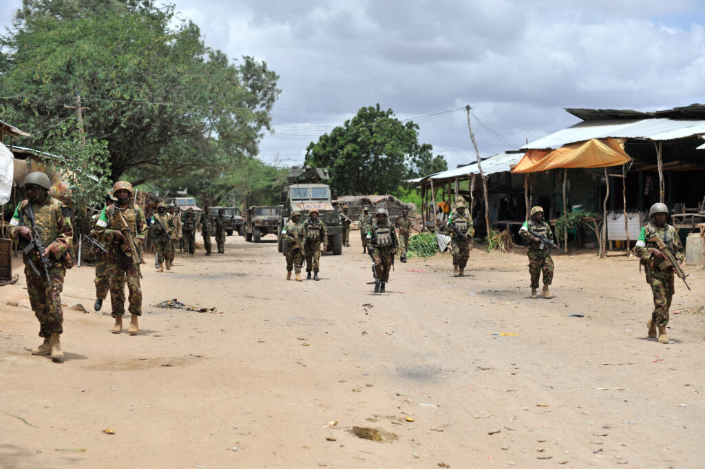 Kenyan Defence forces (KDF) serving with the African Union Mission in Somalia (AMISOM) on foot patrol in Bardera, Somalia on August 18 2015. AMISOM supporting the Somali National Army (SNA) recently liberated the city from the Al Qaeda-affiliated extremist group Al Shabaab. AMISOM Photo / Ilyas Ahmed