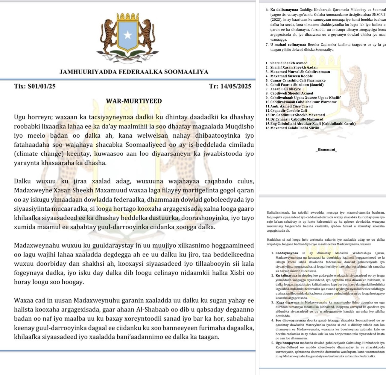 War-saxaafadeedka oo ay si wadajir ah u saxiixeen siyaasiyiin horey u soo noqday madaxwayneyaal, raiisul wasaarayaal iyo masuuliyiin sare ayaa lagu sheegay: