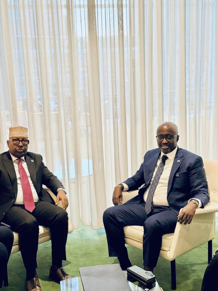Wasiirka Arrimaha Dibadda iyo Iskaashiga Caalamiga, Mudane Danjire Axmed Macallin Fiqi Axmed, ayaa maanta kula kulmay Magaalada New York, Wasiirka Arrimaha Dibadda iyo Iskaashiga Caalamiga ee Jamhuuriyadda Rwanda, Olivier Jean Patrick Nduhungirehe, isaga oo kala hadlay horumarinta xiriirka labo geesoodka , adkaynta iskaashi wadaagga iyo xaaladaha amni iyo siyaasad ee gobolka.